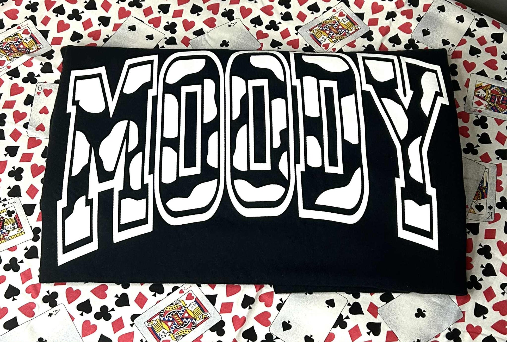 Black colored short sleeved gildan cotton tshirt with white colored "Moody" cow print lettering.