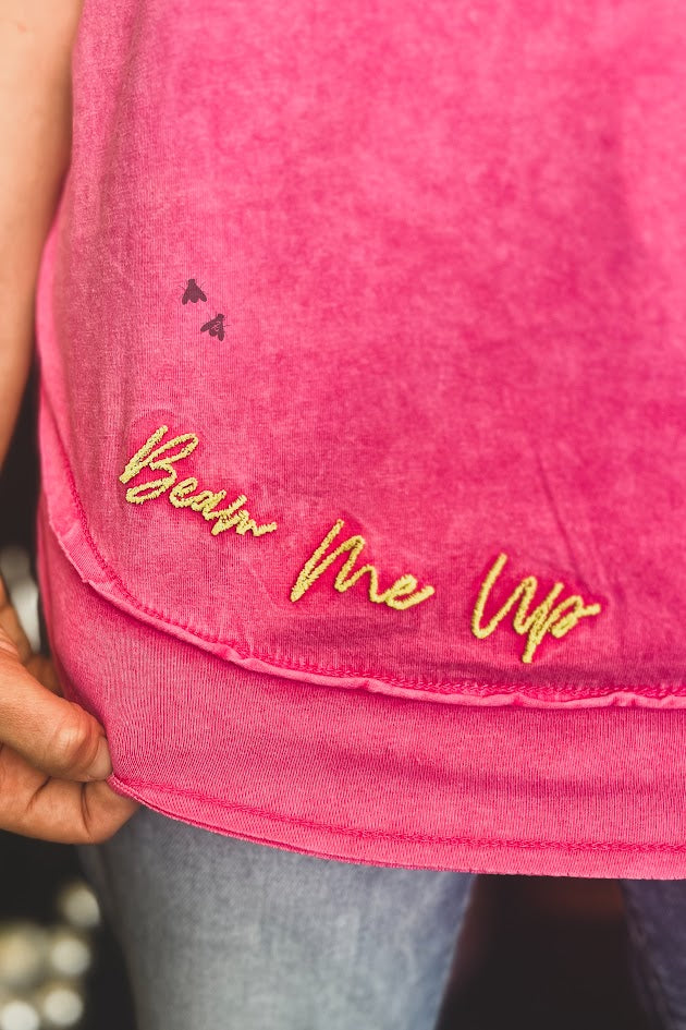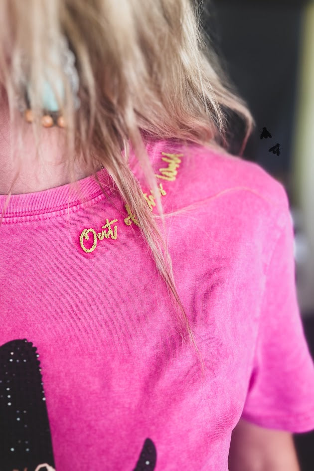 Pink colored top with western themed alien graphic. Has rhinestone accents on hat and earrings. Embroidered accents on neckline and bottom hem. Size 2X